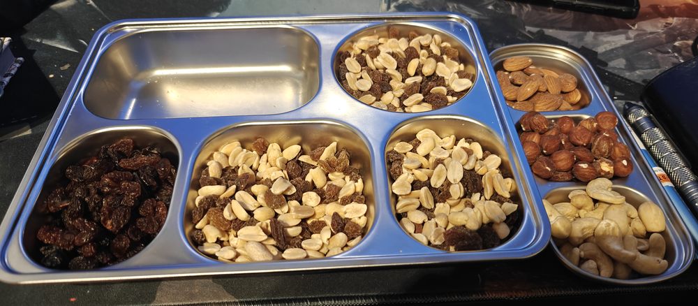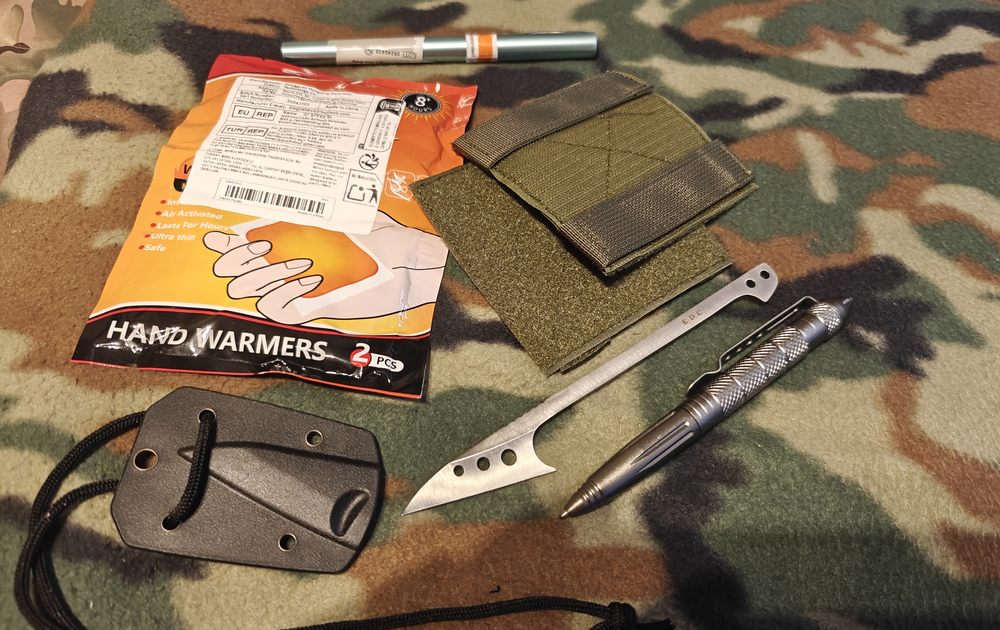 Mały nóż, długopis do samoobrony, miejsce na naszywki doczepiane na molle, ocieplacz do rąk i igła do odbarczania. Na drugim zdjęciu dwa aluminiowe pojemniki już zaadoptowane w orzeszki 😉